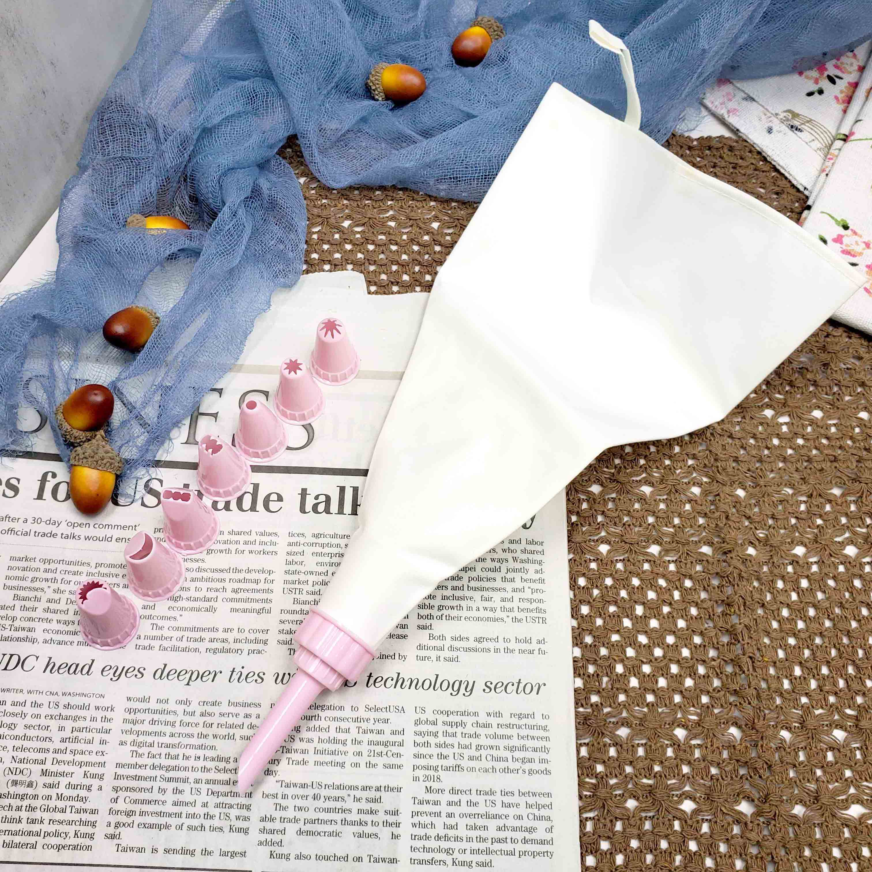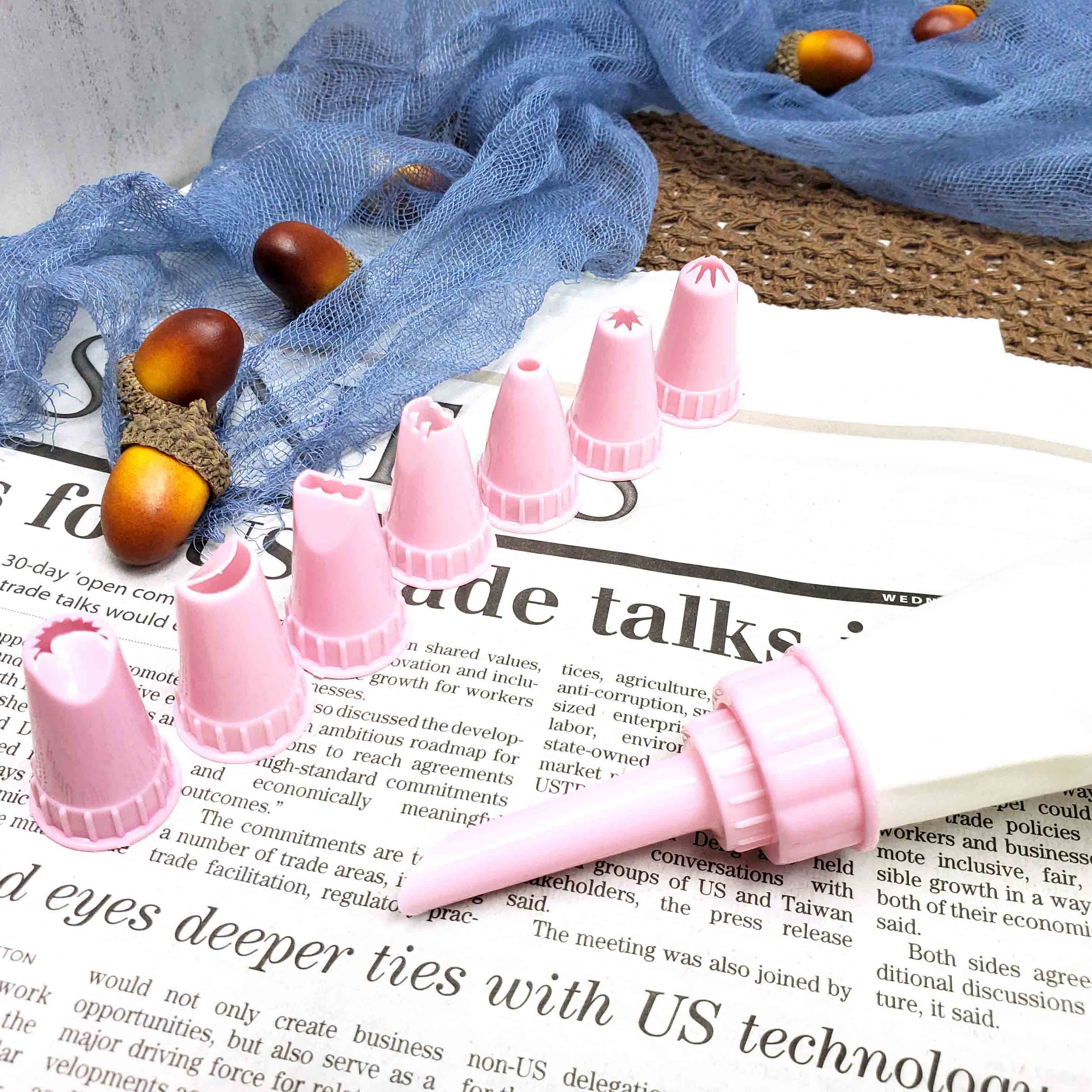 花嘴採用 PP(聚丙烯),耐溫 100℃;擠花袋採用棉布材質,可重複使用且清洗方便。