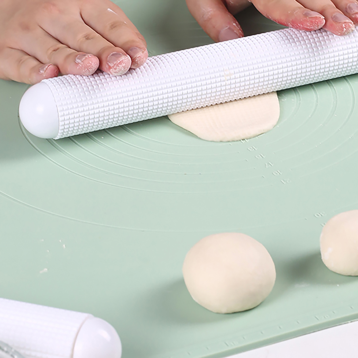 表面凹凸特殊設計,可在桿麵時均勻延展麵團並排出空氣,也可在翻糖上創造紋路,一支多用途。