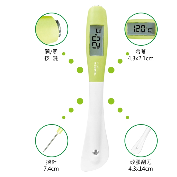 - 即時讀取數字溫度計,在您實際攪拌配料時,可清晰讀取溫度,它比同類產品承受更廣泛的溫度範圍。